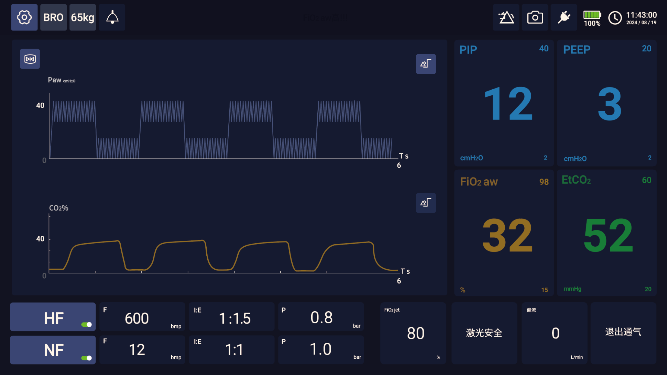 呼气是被动的,机器只负责“喷”气,气体的排出完全依靠患者肺部和胸廓的弹性回缩力。因此,HFJV 需要充足的呼气时间,如果呼气时间不足,容易导致气体陷闭(二氧化碳蓄积)。为了解决前述问题,大略高频喷射通气呼吸机具备高频叠加常频功能,既能保证患者氧合又能有效的排出二氧化碳。
