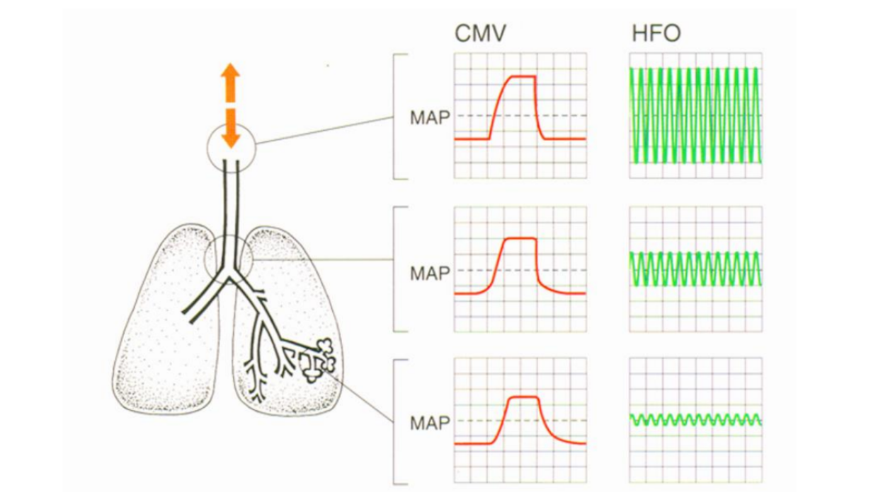 呼气是主动的,机器不仅把气体推进肺里,还通过产生负压把气体“抽”出来。气流在气道内呈正弦波形的往复震荡,不依赖患者胸廓和肺的弹性回缩力。它在整个通气过程中维持一个相对恒定的较高平均气道压(MAP),使肺泡始终处于开放状态。